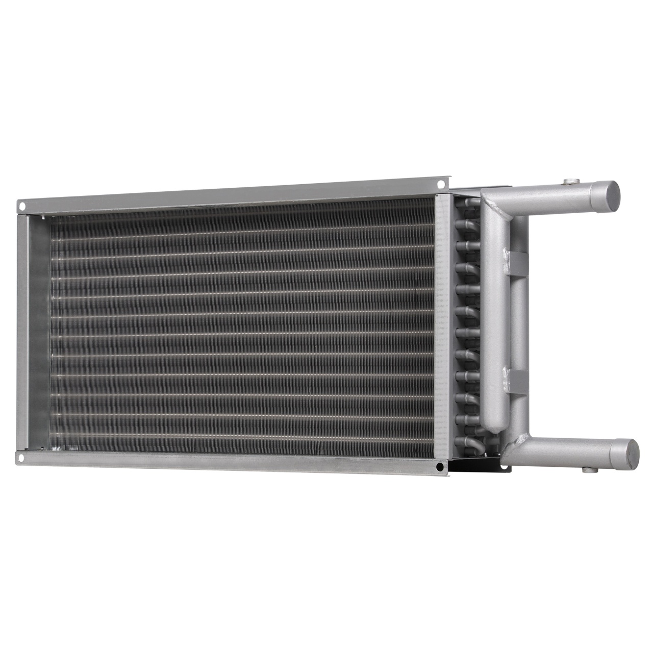 В водяном нагревателе используемый шаг оребрения составляет 2,1 мм., вместо общепринятого (для наборных систем вентиляции) 2,5 мм., что позволило существенно увеличить теплоотдачу, при этом не существенно увеличивается сопротивление теплообменника и оптимизируются массогабаритные показатели.